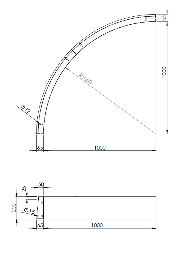 - Binnen- en buitenbochten, radius 50, 100, 150 en 200 cm