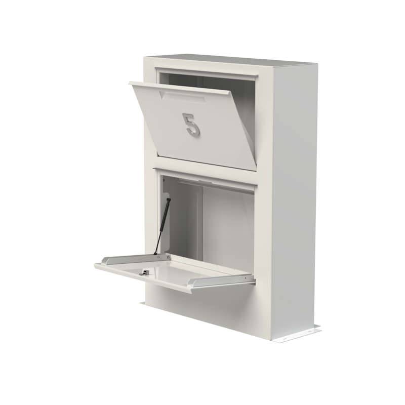 De brief- en pakketopening is aan de voorzijde geplaatst, waarin de pakketbezorger het pakket ( max. 60 x 40 x 24 cm) kan plaatsen. Het openen en sluiten van de klep zorgt dat pakketten en brieven veilig onderin de brievenbus belanden.