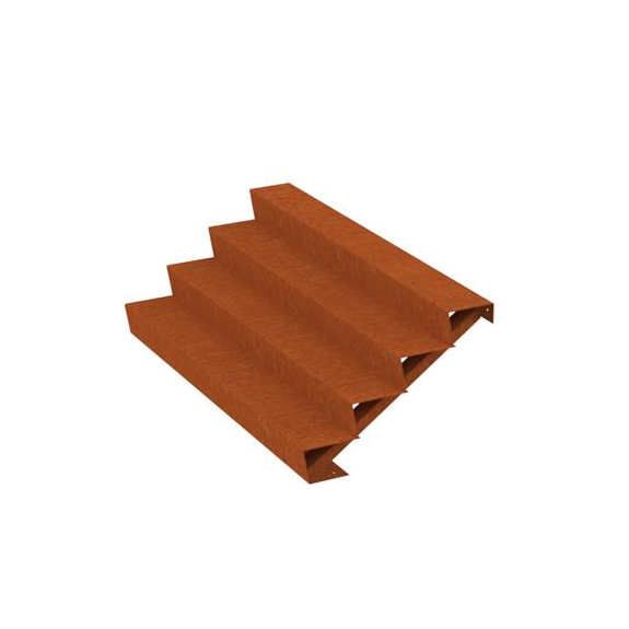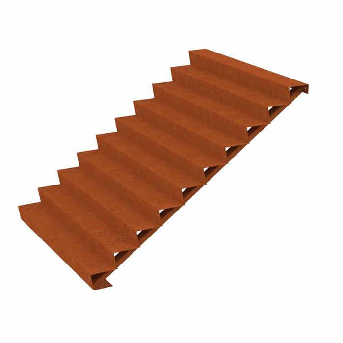 De Cortenstaal trap van 200 cm breed kan geleverd met 2 t/m 10 treden. Zo heeft u altijd de passende tuintrap voor uw tuinproject. De hoogte van de optrede is telkens 17 cm en de aantrede is 24 cm.