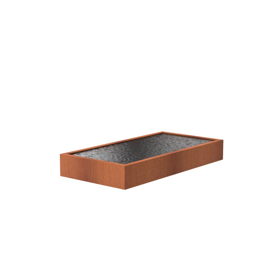De vijvers worden ongeroest afgeleverd, met enkele weken/maanden zijn de bakken volledig geroest. Hoewel de patina permanent is, kan het voorkomen dat er, zeker in de eerste maanden, onder invloed van bijv. regen wat uitspoelt / afgeeft. Alle vijvers zijn aan de binnenkant voorzien van een sterke en slijtvaste 2mm dikke polyurea coating.